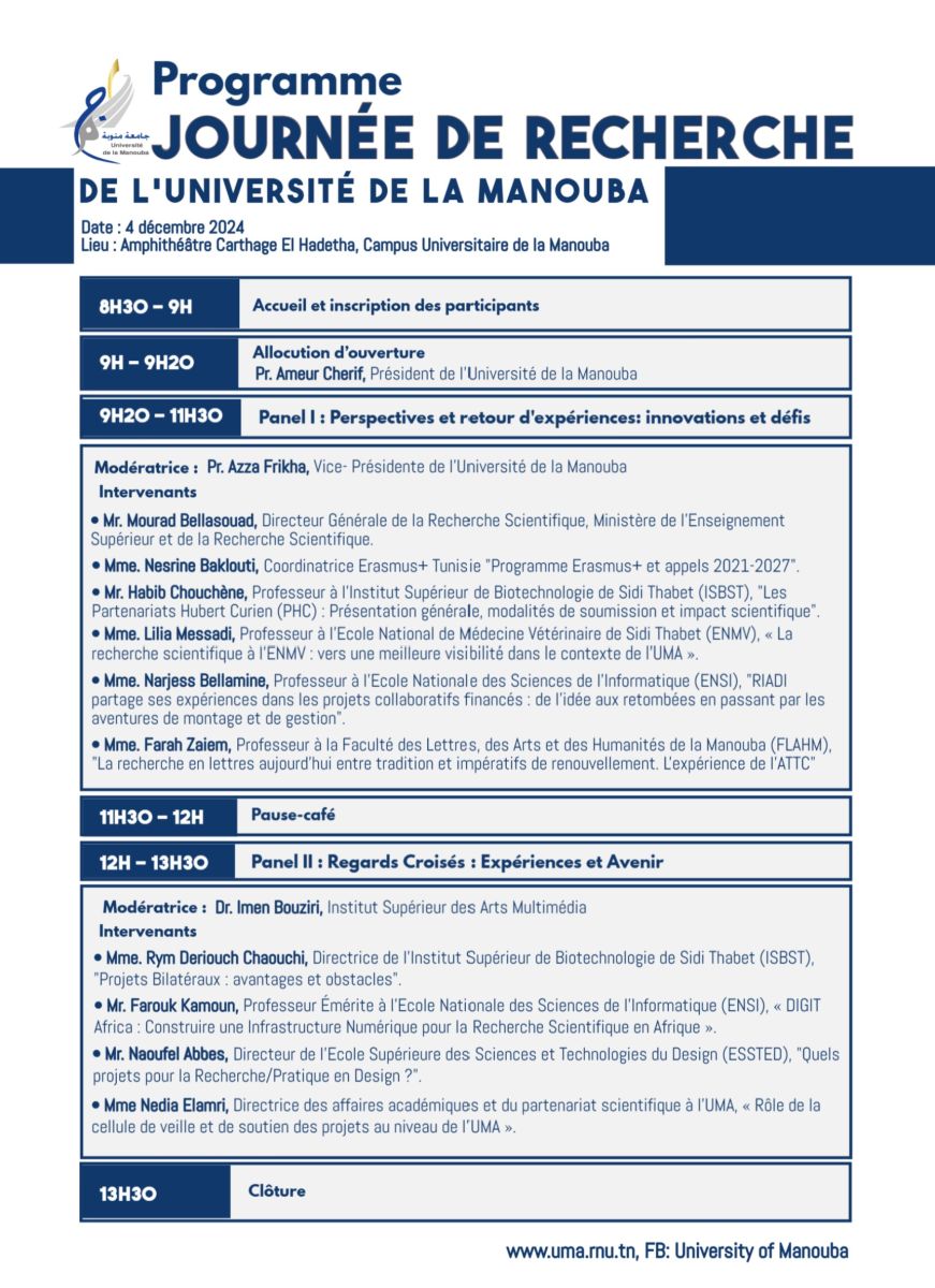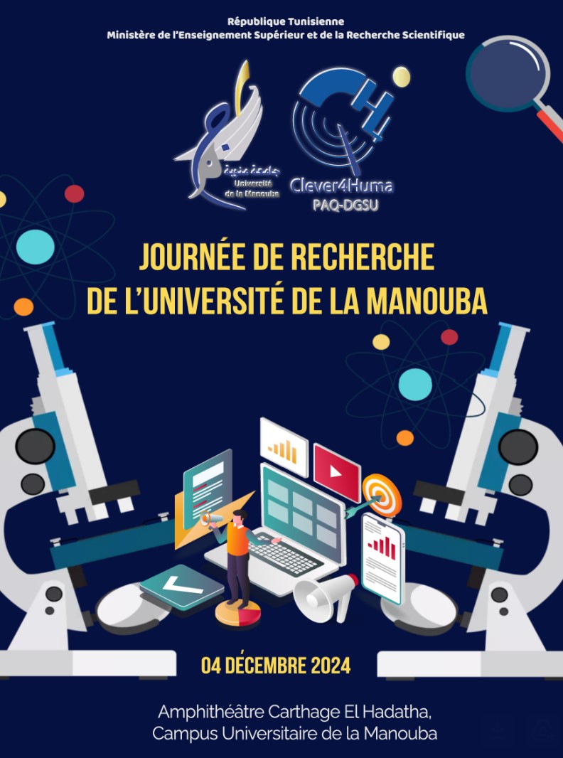 Le 4 décembre 2024, l'Université de la Manouba a organisé une Journée dédiée aux Présentations des prjets de recherche , rassemblant chercheurs, étudiants et professionnels de divers domaines. Cet événement sera une occasion unique de partager les avancées scientifiques et de renforcer les collaborations interdisciplinaires.