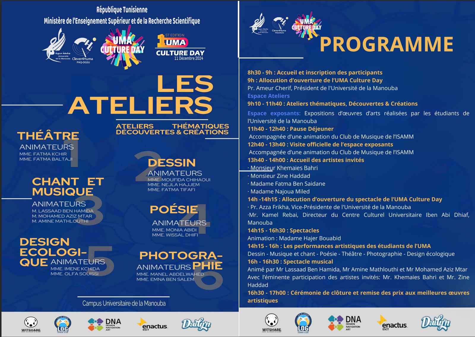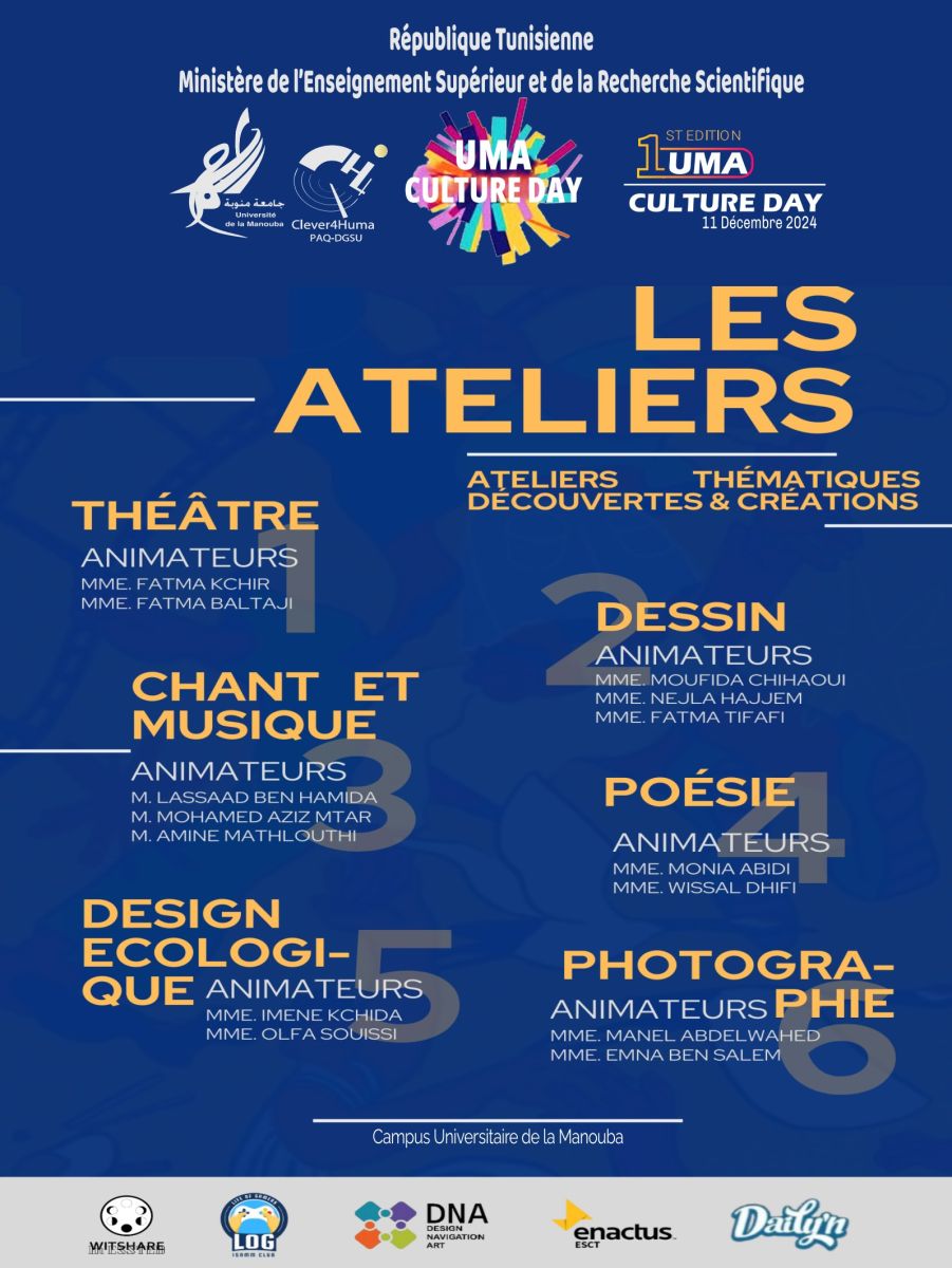 L’université de la Manouba a organisé la 1ère édition de l’UMA Culture Day et ce le 11 décembre 2024. Il s’agit d’un évènement visant à valoriser les talents artistiques de nos étudiants. Cet évènement a donné l’opportunité de participer à diverses activités culturelles (théâtre, poésie, dessin, musique, chant, etc.) et d’exposer leurs œuvres artistiques. Un concours récompensera les meilleures œuvres artistiques.