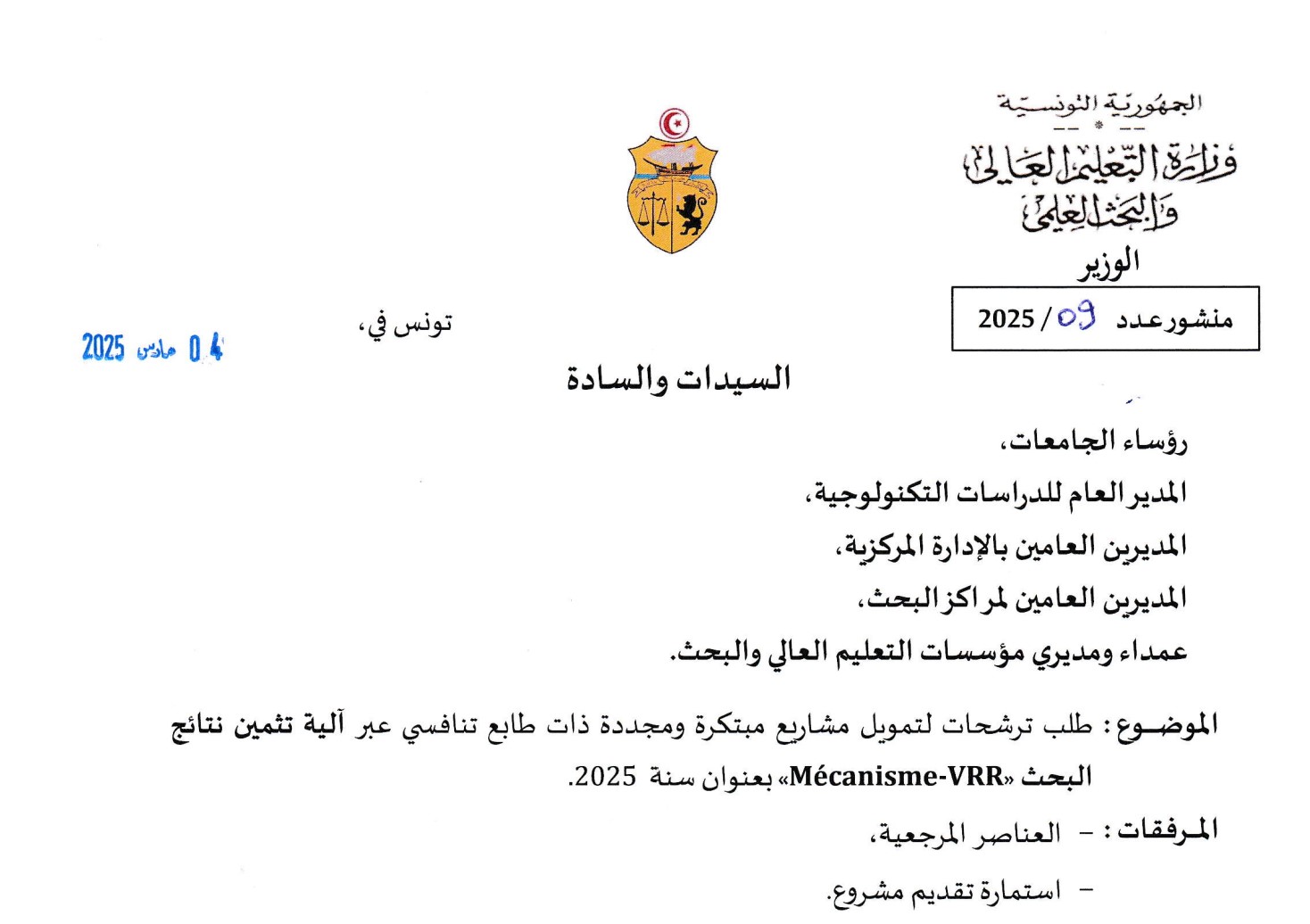 | Circulaire ministérielle N° 09/25 du 04 mars 2025. | Termes de Référence de l'appel à propositions. | Formulaire de soumission d’un projet VRR. | Plan de mise en œuvre d’un projet VRR. |