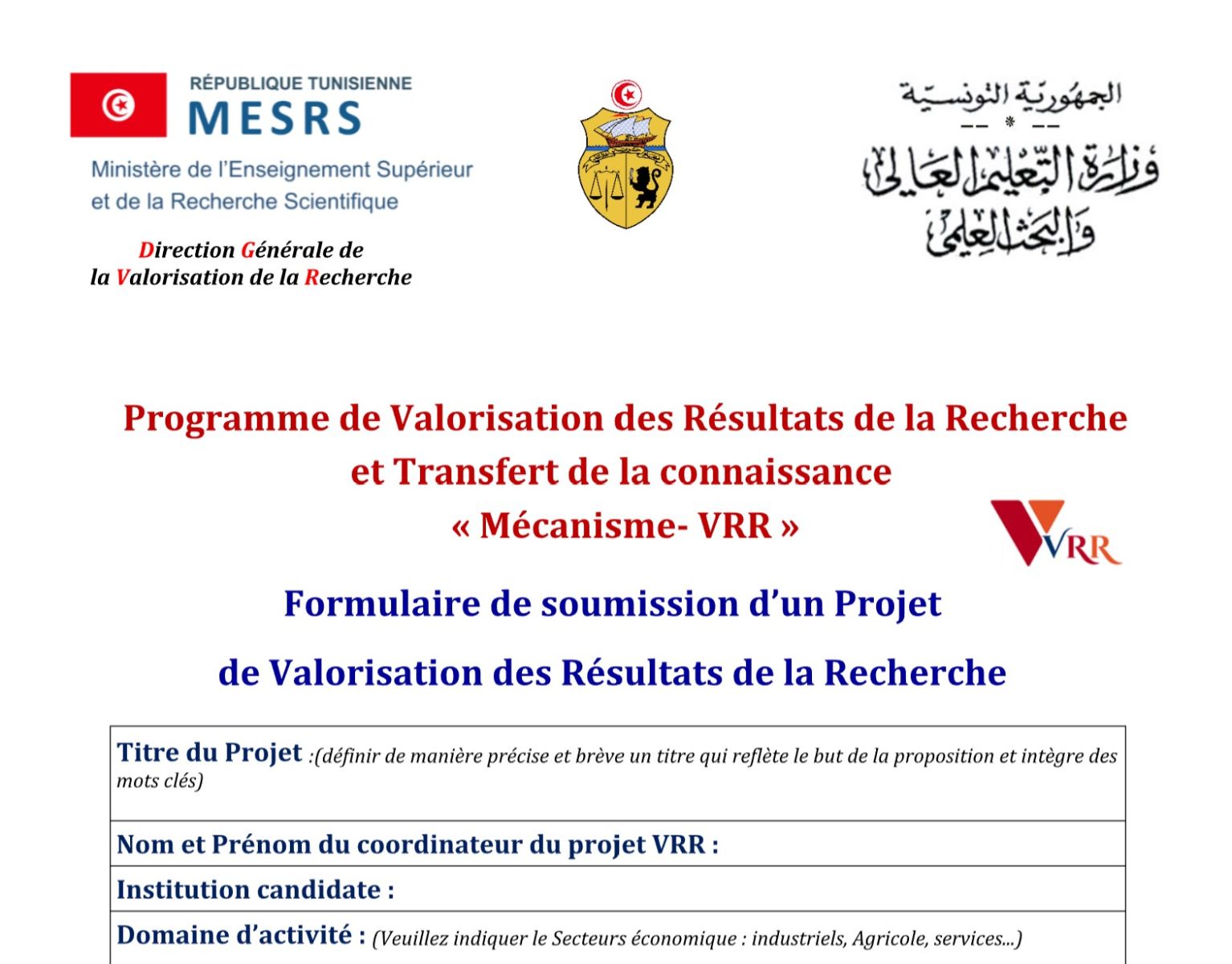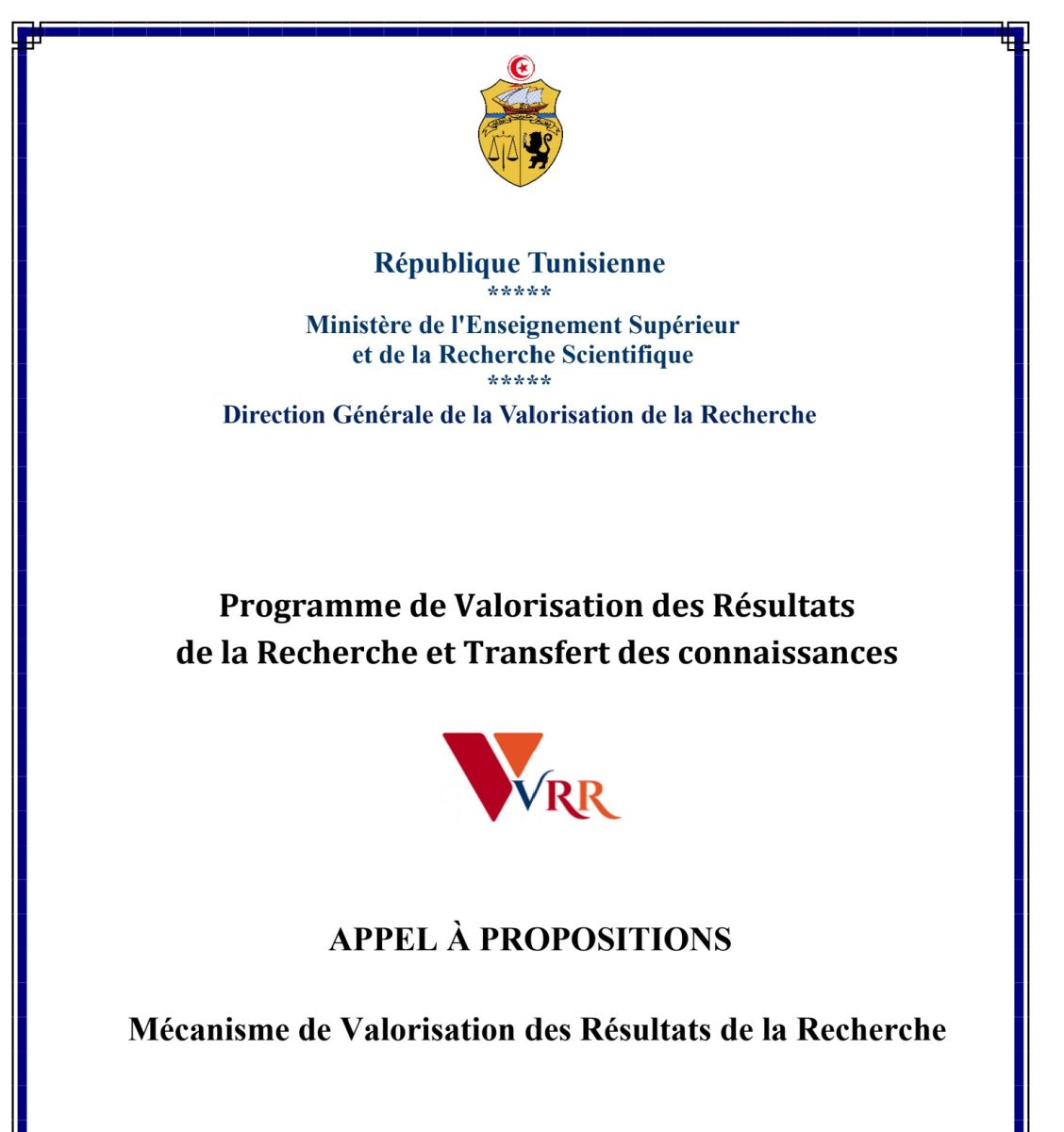 Le Ministère de l'Enseignement Supérieur et de la Recherche Scientifique, par le biais de la Direction Générale de la Valorisation de la Recherche, a le plaisir d'annoncer le lancement de l'appel à propositions pour financer des projets innovants. Cet appel s'adresse aux établissements publics d'enseignement supérieur et de recherche ainsi qu'aux centres de recherche, en partenariat avec les acteurs de l'environnement socio-économique.