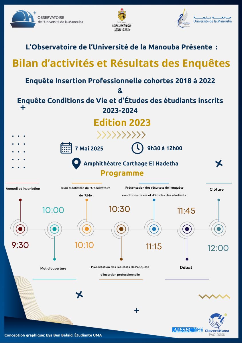 L’Observatoire UMA a organisé son deuxième événement de Reporting le Mercredi 7 Mai 2025 à 9h30, à l’Amphithéâtre Carthage El Hadetha. Cet événement a permis de mettre en lumière les résultats des enquêtes de l’édition 2023, offrant un regard approfondi sur l’insertion professionnelle des diplômés des établissements de l’UMA et les conditions d’études et de vie des étudiants inscrits en 2023/2024. Cette rencontre a également marqué la transition vers une nouvelle phase, avec la clôture de la phase 1 du projet "Dynamisation de l’Observatoire UMA" et le lancement de la phase 2 consacrée à son opérationnalisation. Un moment d’échanges et de réflexions précieuses pour renforcer cette entité stratégique et guider son avenir !