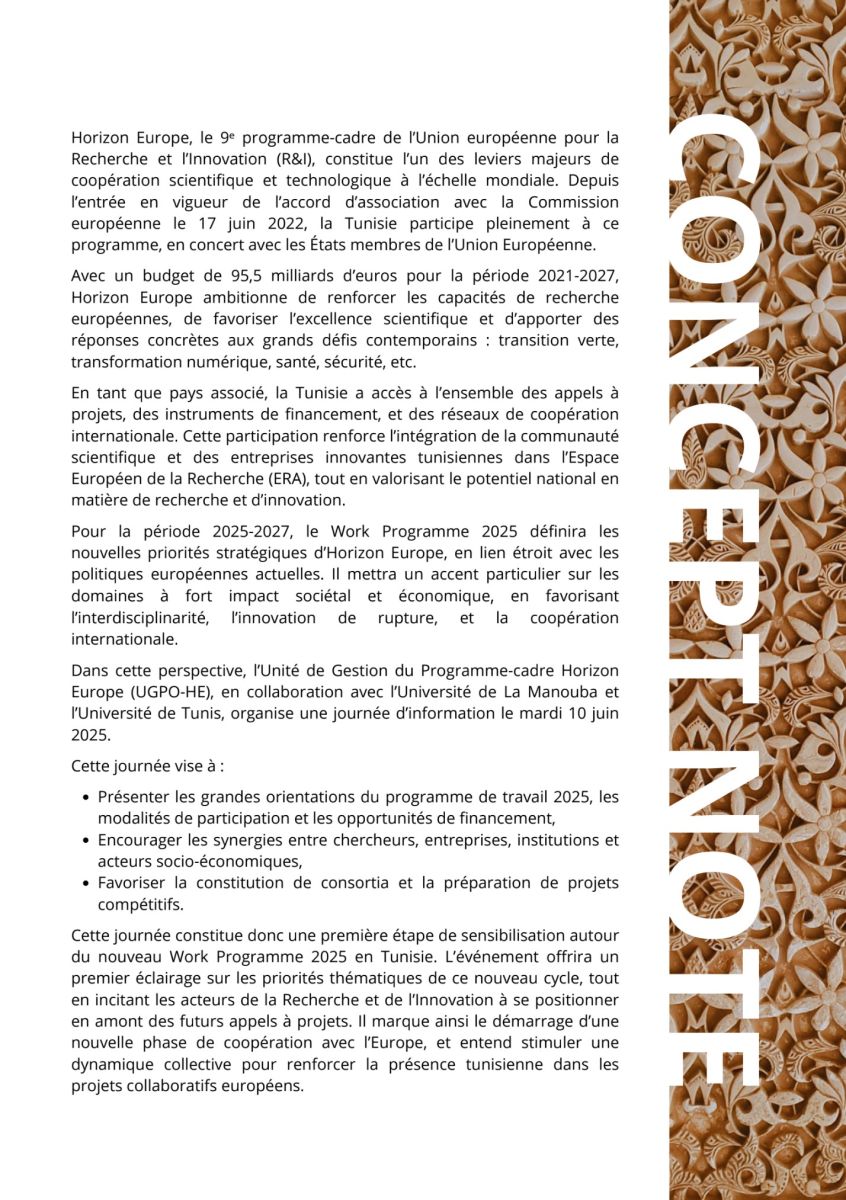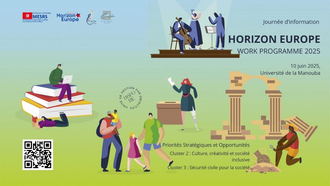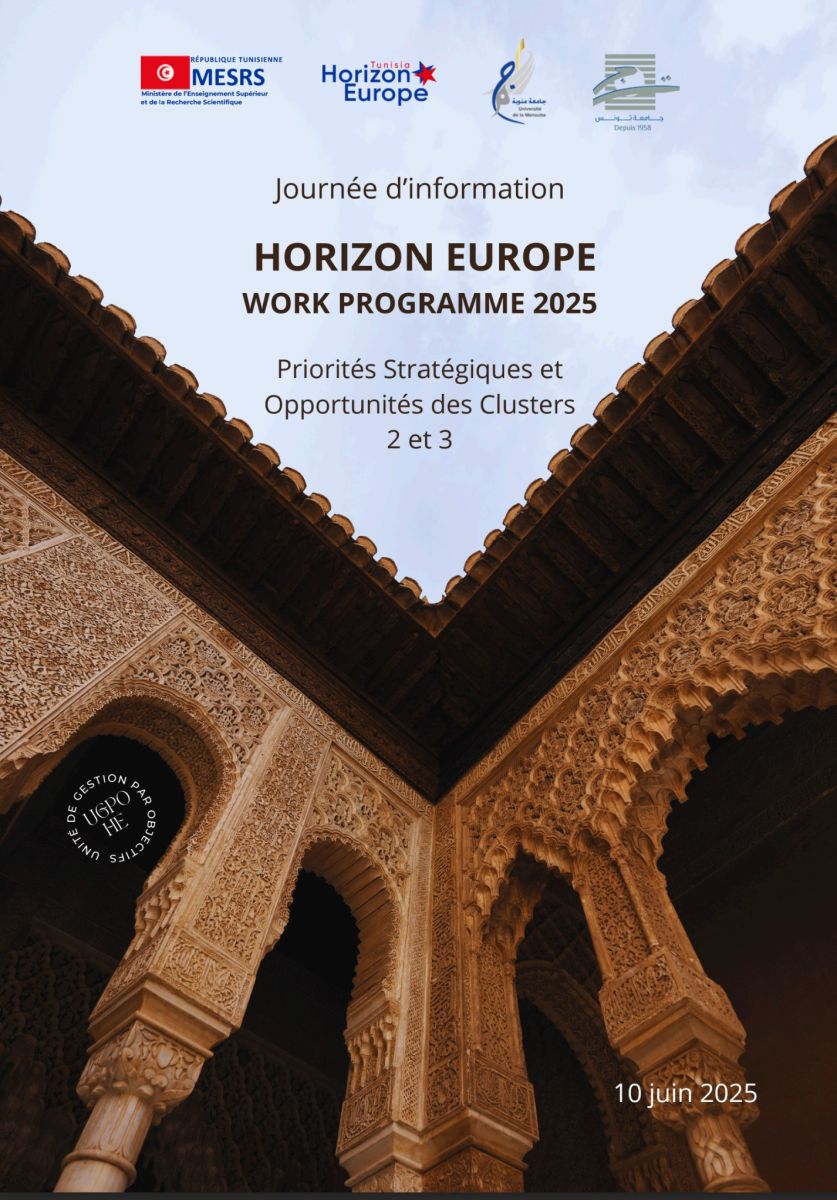 L'Unité de Gestion par Objectifs chargés du programme-cadre européen Horizon Europe [UGPO-HE], Ministère de l'Enseignement Supérieur et de la Recherche Scientifique [MESRS], en collaboration avec l'Université de La Manouba et l'Université de Tunis , organise une journée d'information sur le "WORK PROGRAM (calendrier des appels à projets) 2025 D'HORIZON EUROPE" , et ce, le mardi 10 juin 2025 à partir de 09h00. Cette journée sera l'occasion pour présenter aux porteurs d'idées de projets les opportunités de financement offertes par le programme européen Horizon Europe dans le cadre des clusters 2 "Culture, Creativity and Inclusive Society" & 3 "Civil Security for Society", à travers le programme de travail 2025. Elle offrira également l'occasion de mettre en lumière le rôle transversal des Sciences Humaines et Sociales (SHS), dont l'intégration est encouragée dans l'ensemble des thématiques du programme Horizon Europe, ouvrant ainsi un large éventail d'opportunités de financement pour les chercheurs issus de ces disciplines. |