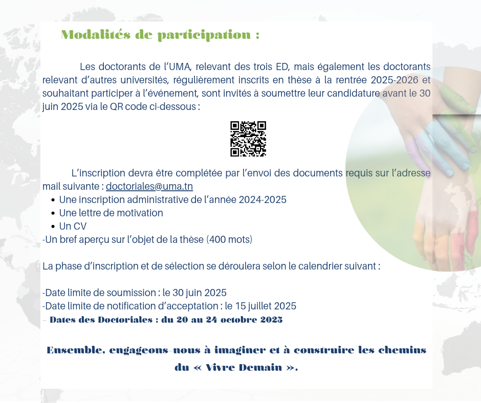 Les doctorants de l’UMA, relevant de ses15 institutions et de ses 3 ED, mais également les doctorants relevant d’autres universités, régulièrement inscrits en thèse à la rentrée 2025-2026 et souhaitant participer à l’événement, sont invités à soumettre leur candidature avant le 30 juin 2025 via le lien Google Forms