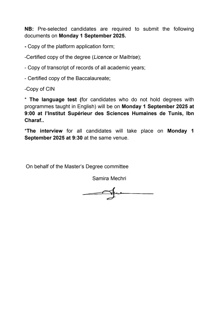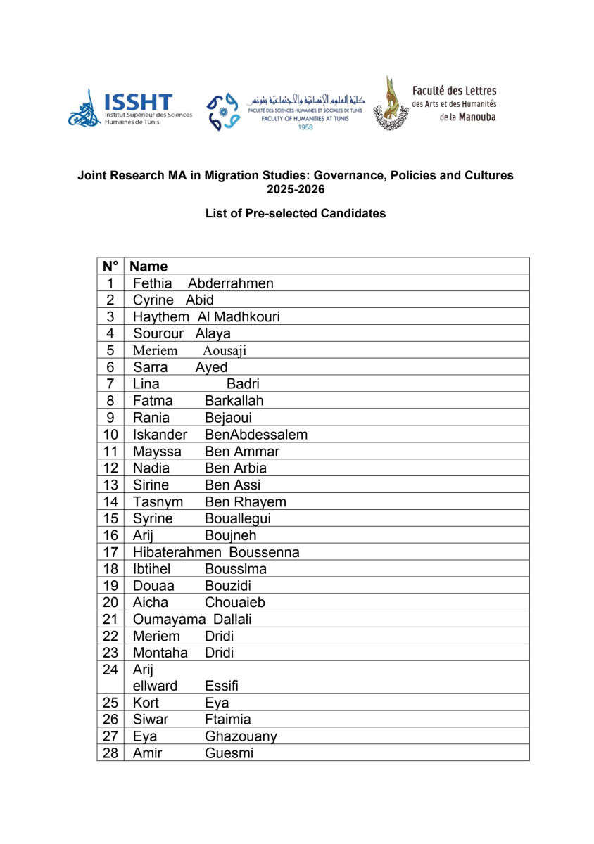 List of Pre-selected Candidates for the MA in Migration Studies (Fw : Liste des candidats présélectionnés pour le Master en études migratoires)