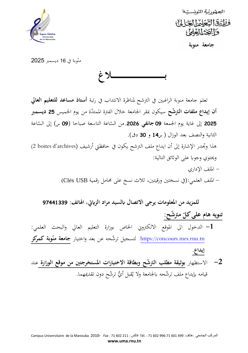 Il est porté à la connaissance des candidats souhaitant participer au concours de recrutement au grade de Maitres-assistants de l’enseignement supérieur que le dépôt des dossiers se fera au siège de l’Université de La Manouba, durant la période allant du jeudi 25 décembre 2025 au vendredi 09 janvier 2026, de 09h00 à 14h30.