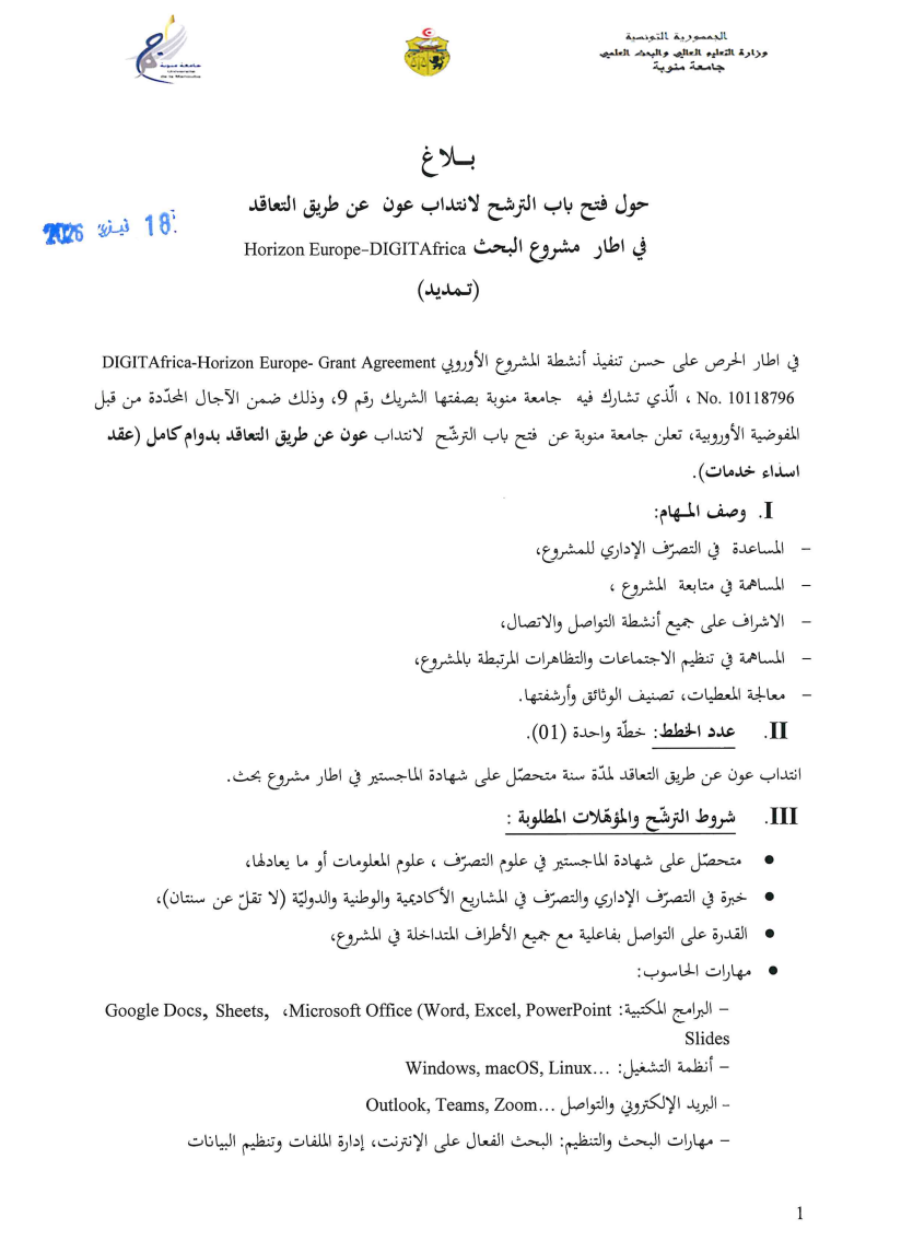 L’Université de La Manouba / projet DIGITAfrica – Horizon Europe : Recrutement d’un agent contractuel (Report des délais)/date limite 15 Mars 2026