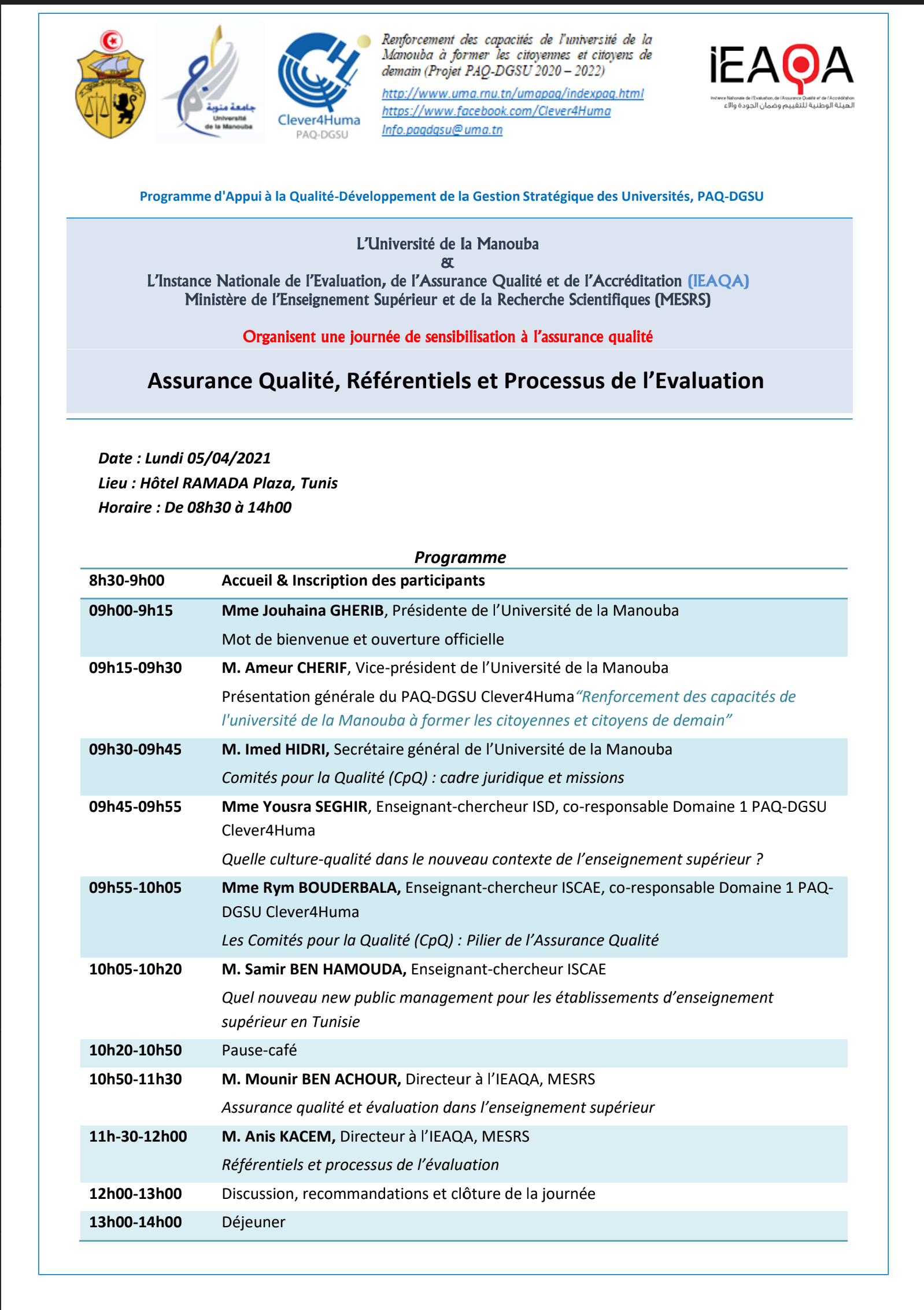 Journée de sensibilisation à l’assurance qualité Assurance Qualité, Référentiels et Processus de l’Evaluation à l’Hôtel RAMADA Plaza5 Avril 2022D1